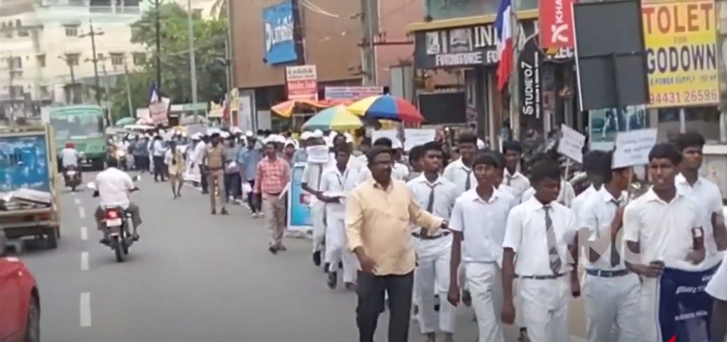 போதை பொருளுக்கு எதிரான விழிப்புணர்வு பேரணி சுமார் 7 பள்ளிகளைச் சேர்ந்த 200 நாட்டு நல பணி திட்டம் என் எஸ் எஸ் மாணவர்கள் போதை பொருட்களுக்கு எதிரான பதாகைகள் ஏந்தி விழிப்புணர்வு பேரணி நடைபெற்றது October 3, 2025 மாவட்ட செய்திகள்