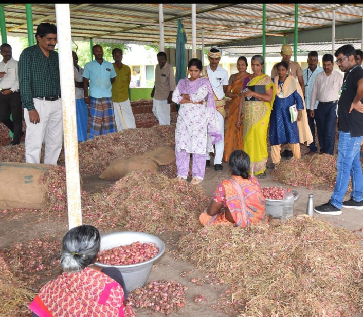 பெரம்பலூர் மாவட்டம், ஆலத்தூர் வட்டத்திற்குட்பட்ட செட்டிகுளம் பகுதியில் சின்னவெங்காயம் உற்பத்தி விவசாயிகளின் வயல்களுக்கே சென்று மாவட்ட ஆட்சித்தலைவர் ந.மிருணாளினி, இ.ஆப., பார்வையிட்டு ஆய்வு செய்து, சின்ன வெங்காய வணிக வளாகத்தில் அமைக்கப்பட்டுள்ள மதிப்பு கூட்டக்கூடிய இயந்திரங்களை பார்வையிட்டு, சின்ன வெங்காய விவசாயிகளுடன் கலந்துரையாடினார். அப்போதுவிவசாயிகளிடையே மாவட்ட ஆட்சித்தலைவர் தெரிவித்ததாவது :