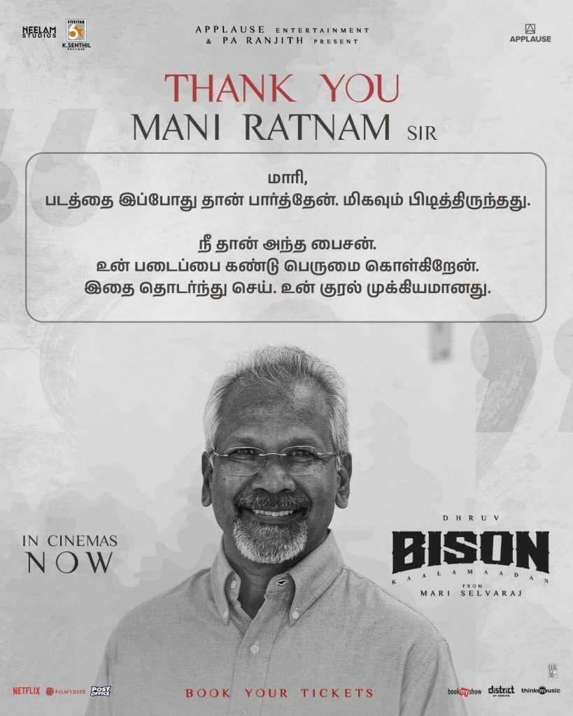 இந்நிலையில் இயக்குனர் மணிரத்னம் பைசன் படத்தை பார்த்துவிட்டு